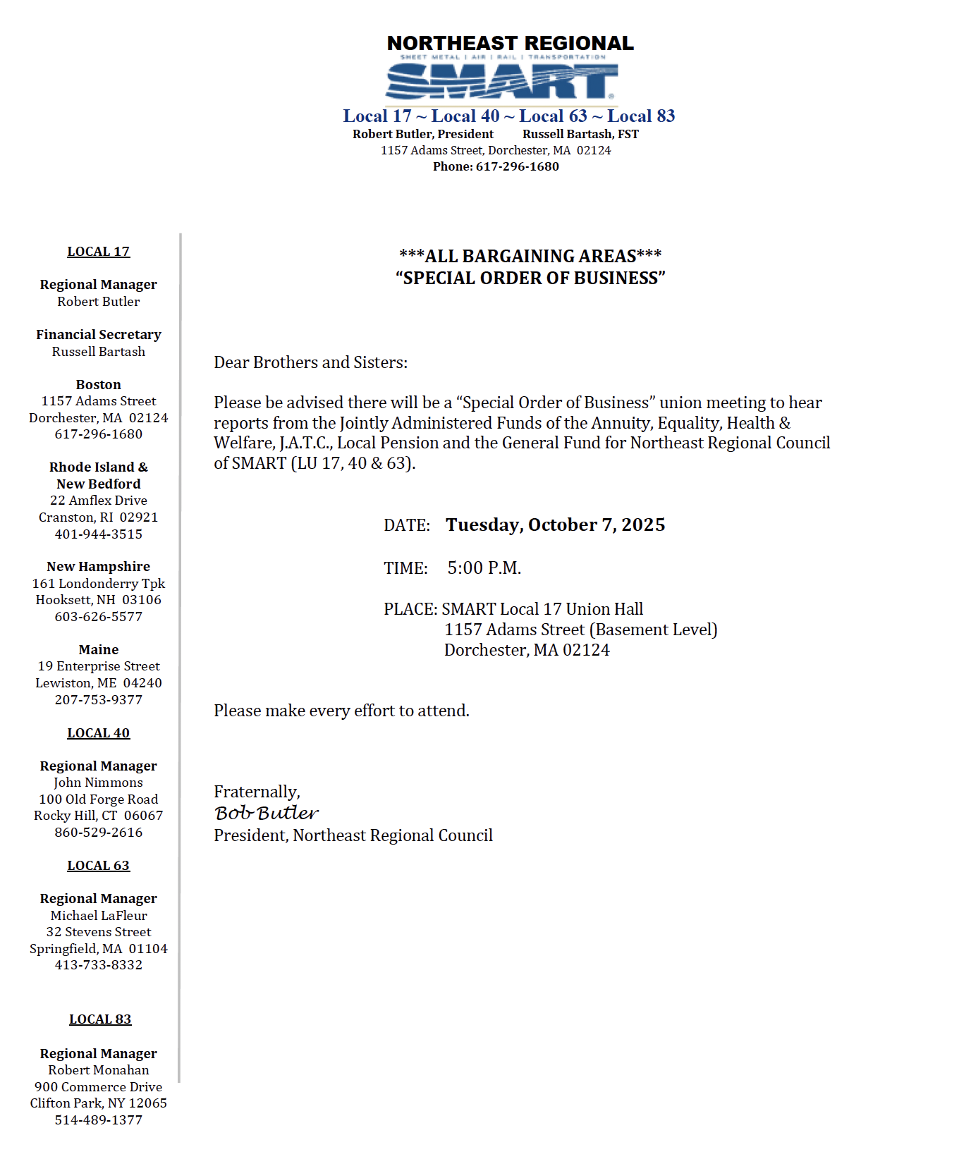 The SMART Northeast Regional Council is composed of Locals 17, 40, 63, and 83 spanning across New England. With nearly 4,000 members and counting, we use our collective bargaining power to fight for better training, benefits, and wages for our workers and a better future for our communities.